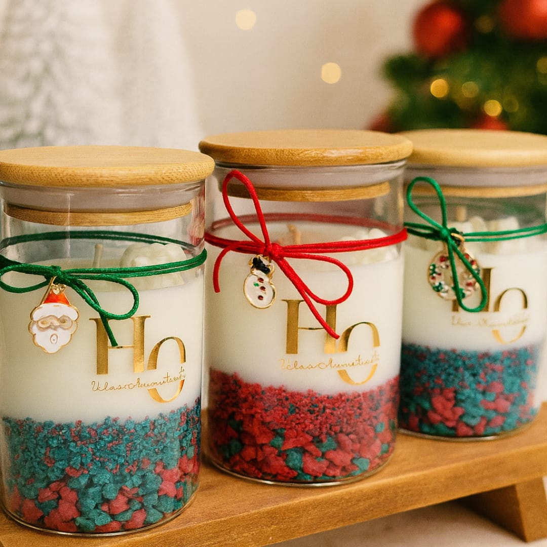 Cada vela é cuidadosamente produzida com 200 g de cera natural, tampa hermética em bambu e acabamento superior com wax melts decorativos, trazendo charme e autenticidade à sua decoração de fim de ano.